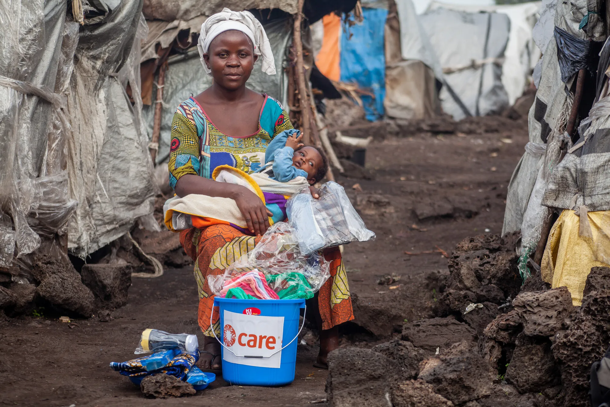 Neema Zawadi sits outside her home in the Mudja, DRC IDP Camp. She was pregnant with the child she is now holding when the conflict started. Photo: Kelvin Batumike/CARE DRC